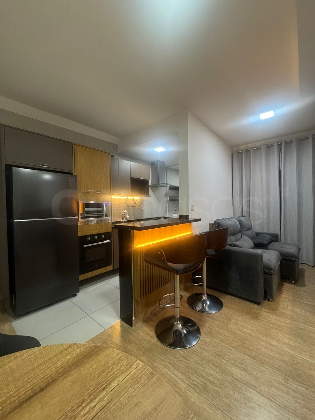 O imóvel possui armários planejados, Cooktop, Forno Elétrico, Micro Ondas inox, Geladeira inox Frost Free Duplex 382L, Ar-condicionado 12000BTU´s, Smart TV 55” com giro 360º, Sofá retrátil e reclinável, Bar espelhado c/iluminaçao Led, ripado balcão com Led, 2 Banquetas giratórias(madeira curvada) Mesa c/3 cadeiras (Eames Eiffel) Bancada p/escritório, Cama Box Queen com molas ensacadas. Cortinas blackout e Iluminação em led.