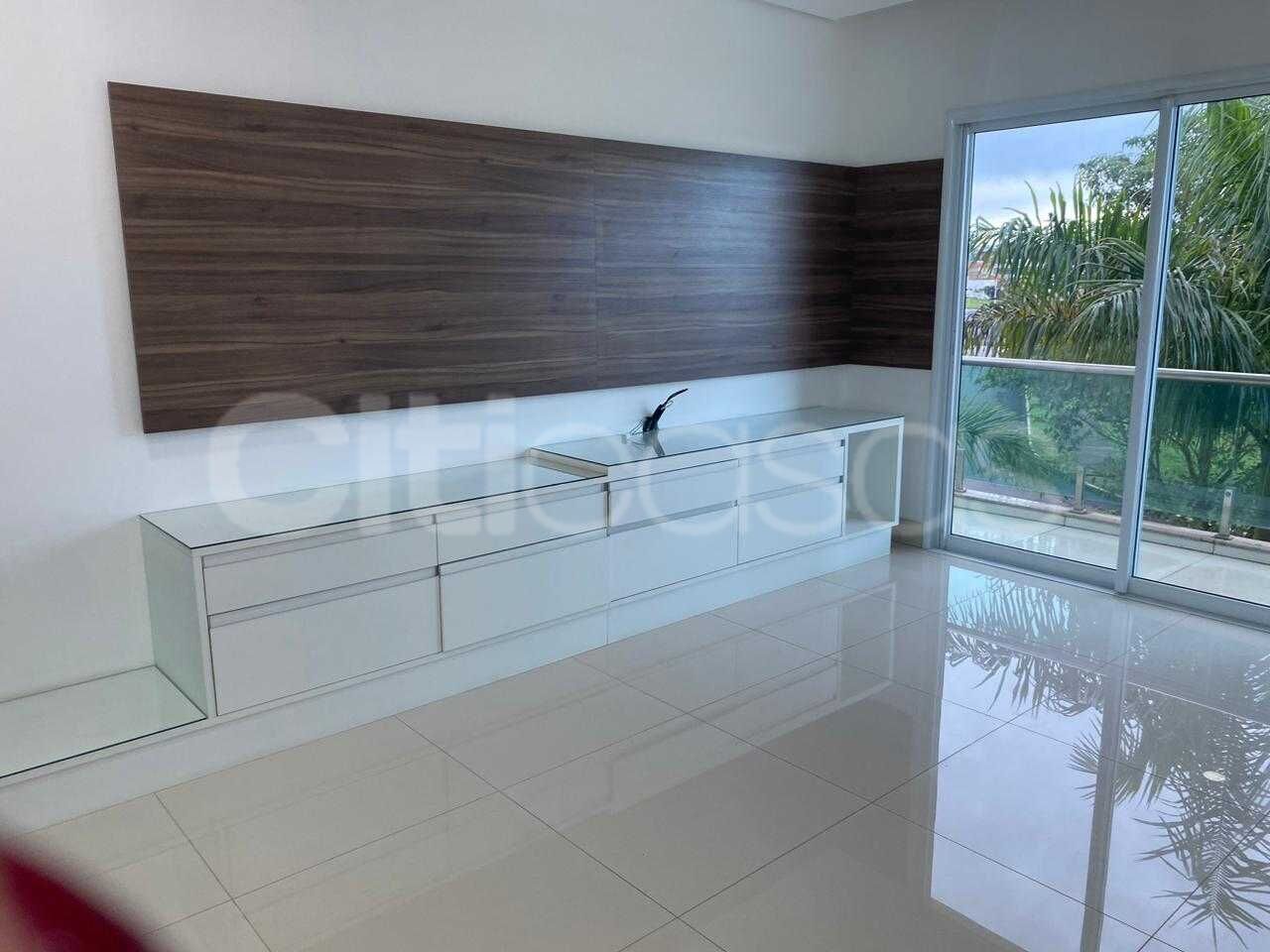 Sobrado totalmente clean, repleto de armarios, lustres, gesso, box, persianas elétricas, luminárias, espelhos, duchas; 4 suítes, todas suites com closet e ar condicionado. Suíte principal com hidromassagem e pia dupla. Duas suítes com sacada e um amplo roupeiro e copa no corredor; Home teathear com armários e sacada; Pequeno lago embaixo da escada; Living 2 ambientes com lareira, pé direito duplo e adega; Sala de jantar com mesa; Escritório repleto de armários e mesa; Lavabo; Elevador panorâmico; Ampla cozinha com fogão e exaustor, dependência de empregada com banheiro, lavanderia, despensa; Area de lazer: com piscina com cascata; Área gourmet: com churrasqueira, forno, fogão, exaustor, mesa sinuca, mesa de pembolim, ar condicionado, wc; Quintal: com amplo Gramado e coqueiros; Canil; Horta; 2 Depósitos; Garagem para 03 carros cobertos e 03 carros descobertos; Área de lazer do condomínio: Quadra de futebol, quadra tênis, quadra Beach tênis, play ground, academia, pista de caminhada, lago;