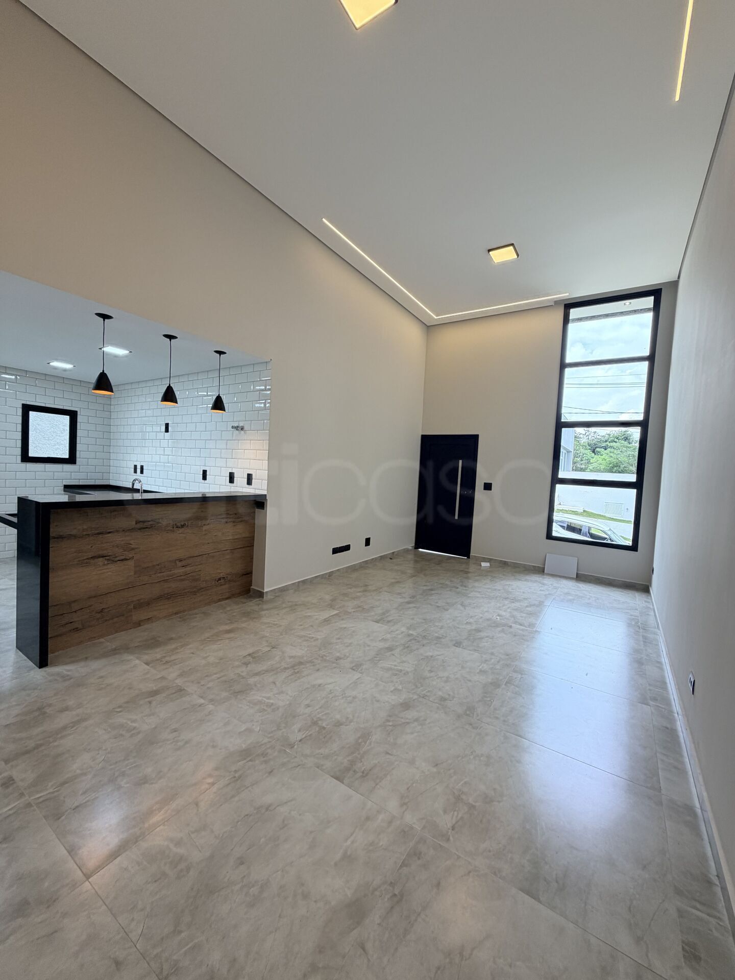 - Sala e garagem com luminárias pretas e detalhes em LED no gesso